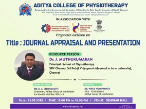 A webinar on JOURNAL APPRAISAL AND PRESENTATION was organized on 31/05/2025 by Dr. J Muthukumaran, Principal , School of Physiotherapy, SBV Chennai Sri Balaji Vidyapeeth (Deemed to be University). Faculties, third- and final-year students of Aditya College of Physiotherapy participated in the webinar. Researching effectively, choosing quality articles, and critically assessing the journals and articles to include in our study were the topics highlighted in the webinar.
